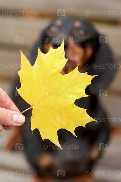 Человеческие руки держат осенний желтый кленовый лист возле собаки таксы