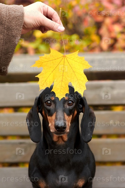 Человеческие руки держат осенний желтый кленовый лист возле собаки таксы