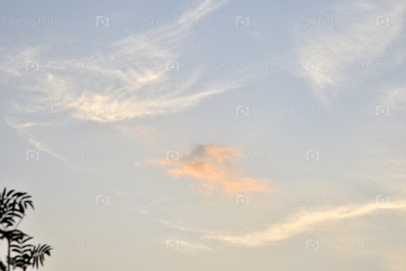 Красивое закатное небо с нежными розовыми облаками. Летний пейзаж заката