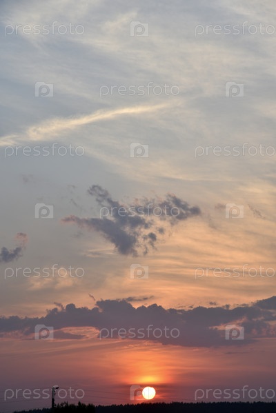 Красивый закат летнего неба облака и летающий самолет. Закатное вечернее небо вечером