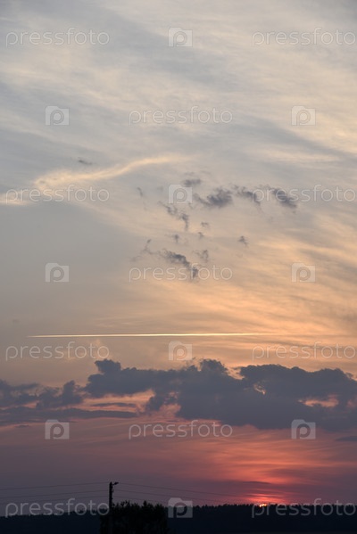 Красивый закат летнего неба облака и летающий самолет. Закатное вечернее небо вечером
