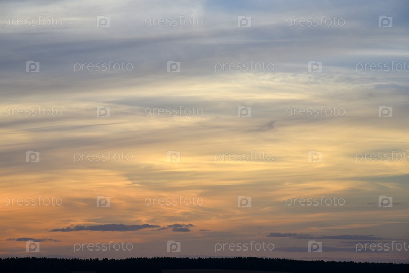 Красивое закатное небо с нежными розовыми облаками. Летний пейзаж заката