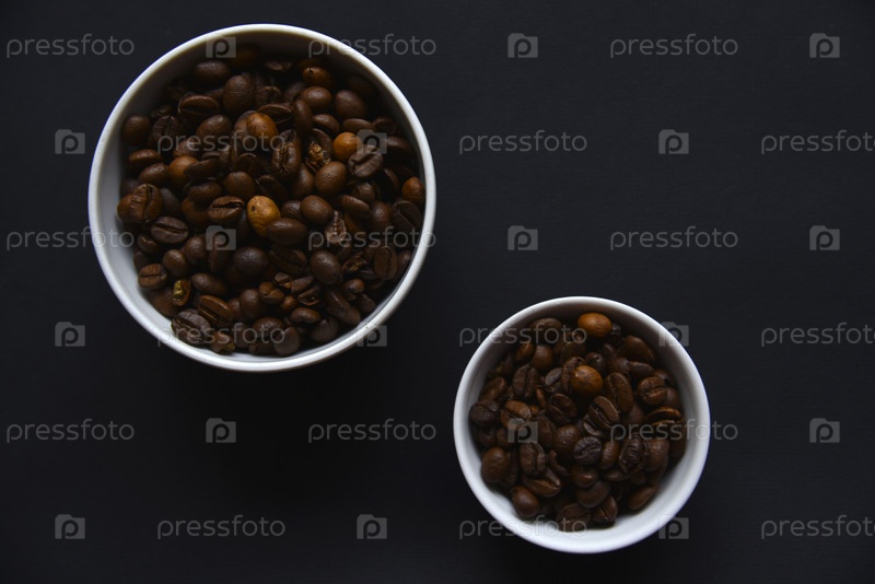 Вкусные кофейные зерна в керамической белой миске на черном фоне. Крупный план кофейных зерен в блюдах