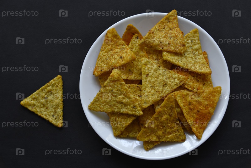 Мексиканские кукурузные чипсы начос с перцем на белой тарелке на черном фоне. Вкусный завтрак из перченых начос