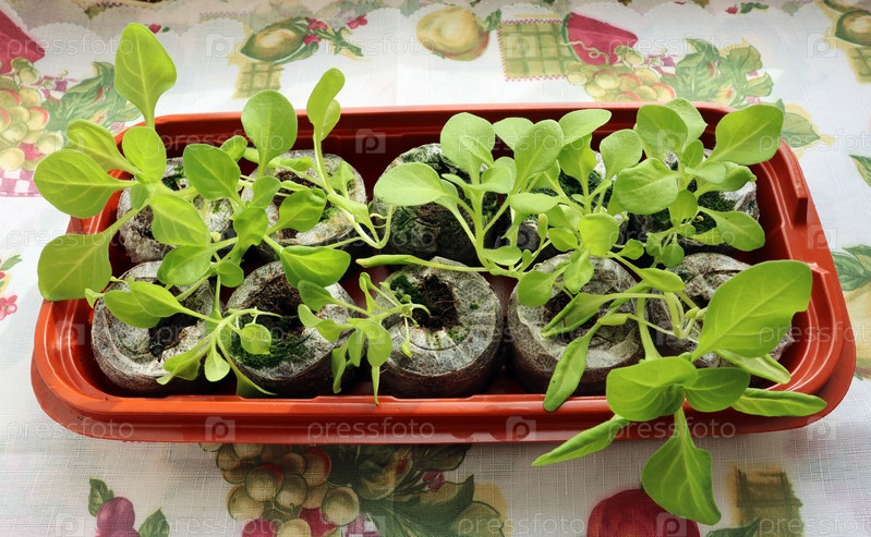 Рассада петунии в торфяных таблетках, помещенных в пластиковый контейнер