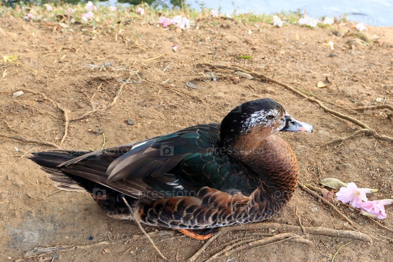 Утка и цветы на берегу пруда