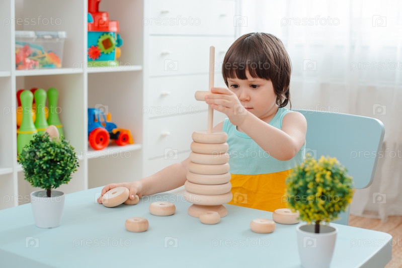 Маленькая девочка собирает деревянную неокрашенную пирамиду. Безопасные детские игрушки из натурального дерева