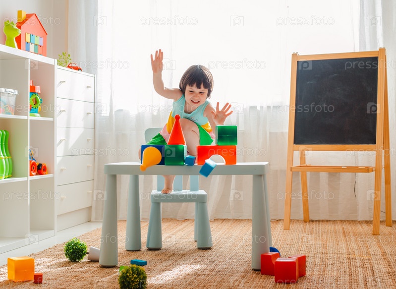Ребенок с удовольствием играет в комнате. Дошкольное, детский сад, 3 года