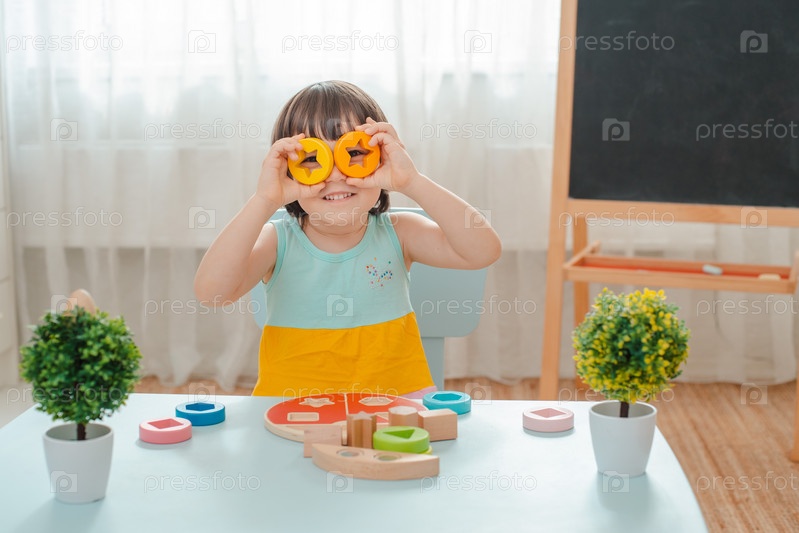 Маленькая девочка собирает деревянную неокрашенную пирамиду. Безопасные детские игрушки из натурального дерева. Деревянные заготовки для творчества. Обучающая игра