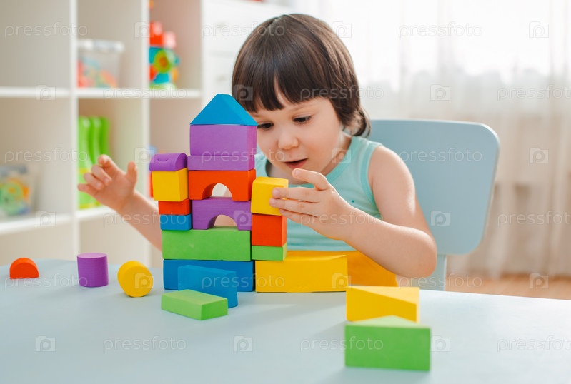 Маленькая девочка собирает деревянную неокрашенную пирамиду. Безопасные детские игрушки из натурального дерева