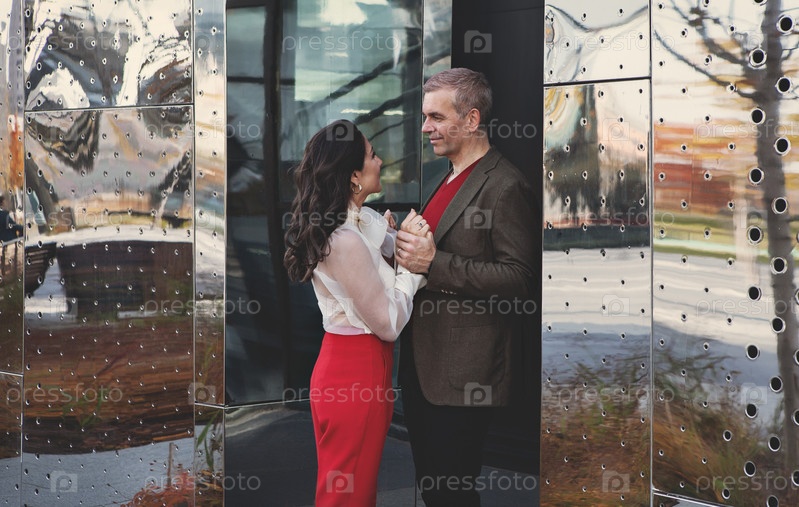 Привлекательная пара коллег разговаривает и флиртует возле офиса. Деловой мужчина и женщина встречаются после работы
