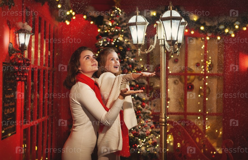 Две молодые девушки улыбаются и весело смотрят на снег на Рождество. Красивые сестры, украшенные рождественской елкой и огнями на заднем плане. Волшебный вечер на улице