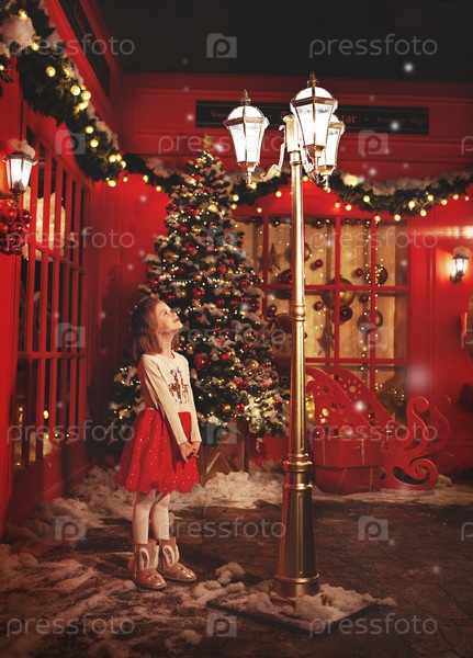 Волшебная маленькая девочка, стоящая на Зимней улице на Рождество и смотрящая на свет. Ребенок возле красной витрины, рождественская елка на заднем плане. Сказочный. Красивая новогодняя и рождественская сцена