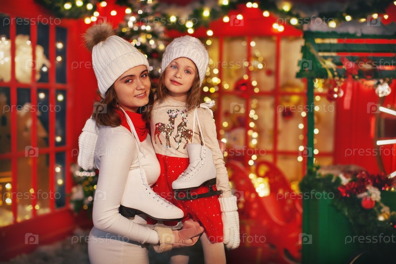 Портрет Веселые девушки в свитере, шляпе, держащие фигурные коньки, смотрящие в камеру. Дети катаются на коньках на рождественской ярмарке. Активный зимний вид спорта. Рождественский семейный отдых с ребенком. Гирлянда из лампочек