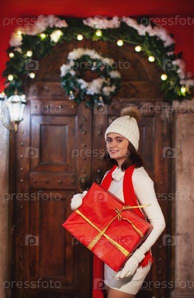 Девушка в шляпе и белом платье держит красный подарок, улыбается и смотрит в камеру. Красивая женщина, стоящая на улице на Рождество или Новый год