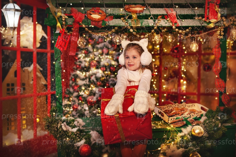 Красивая девушка удивлена рождественским подарком. Симпатичная модель в свитере, варежках и кошачьих ушках. Ребенок на фоне красной витрины на рождественской ярмарке. Стилизация карты сказки