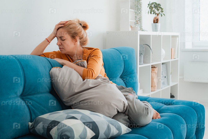 Несчастная одинокая депрессивная женщина дома, она сидит на диване, пряча подушку для лица, концепция депрессии астения