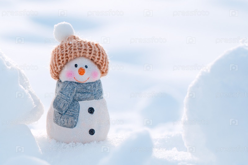 Открытка с новым годом и рождеством с копией пространства. Счастливая декоративная шапка снеговика, стоящая в зимнем рождественском пейзаже солнечного света на открытом воздухе. Снежный фон