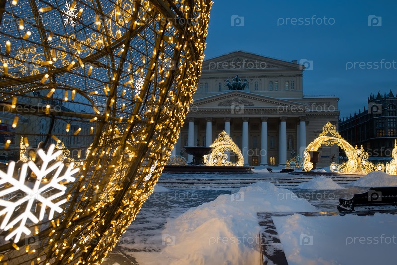 Праздничная Москва. Новый год в России. Новогоднее украшение улиц Москвы. Новогодние украшения перед Большим театром. Зимний вечер в Москве. Рождество в России