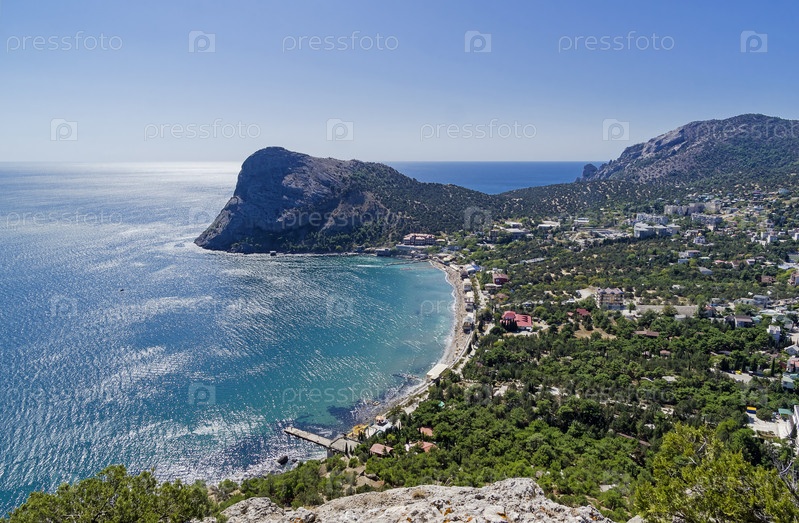 Крым. Вид сверху на курортный поселок Новый Свет и Новосветскую бухту. Солнечный день в сентябре