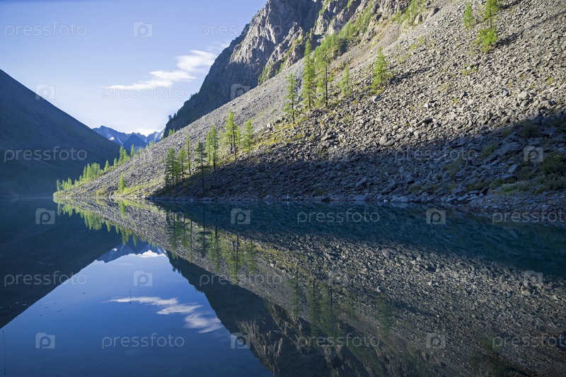 Отражение берега озера в водной глади. Раннее солнечное утро. Большое (нижнее) Шавлинское озеро. Горный Алтай. Август