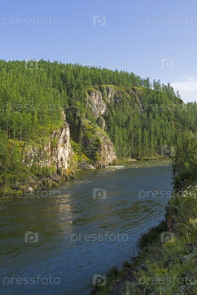Вид на реку Ока Саянская с высокого обрывистого берега. Восточный Саян, Бурятия, Сибирь, Россия