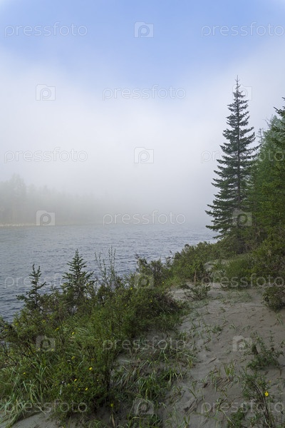 Туманное утро на берегу горной реки. Река Ока Саянская, Восточный Саян, Бурятия, Сибирь, Россия