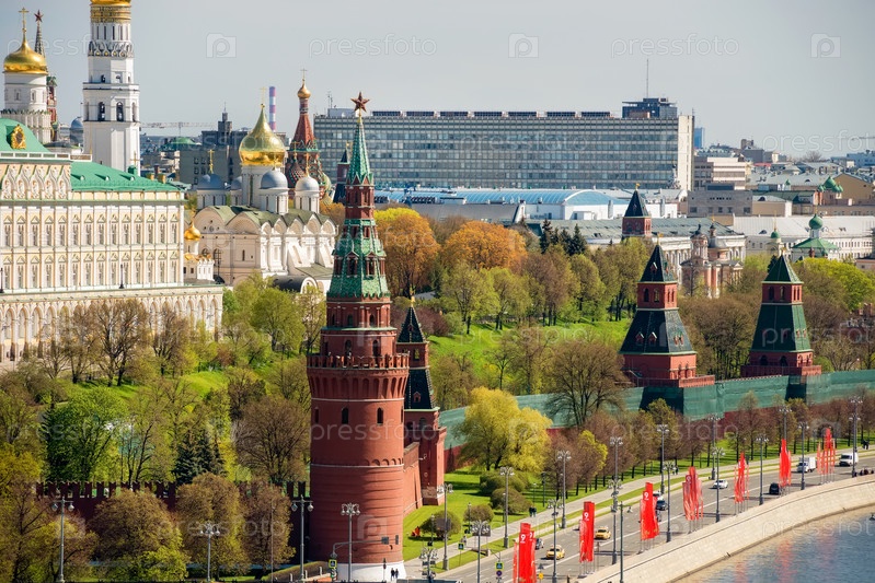Вид с воздуха на Московский Кремль, Москву-реку и набережную Кремля в весенний день