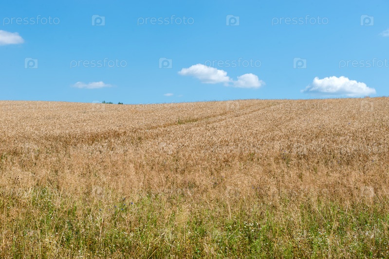 Золотое пшеничное поле и голубое небо с перистыми облаками. Красивый сельский пейзаж под сияющим солнечным светом и голубым небом. Фон созревания колосьев поля луговой пшеницы