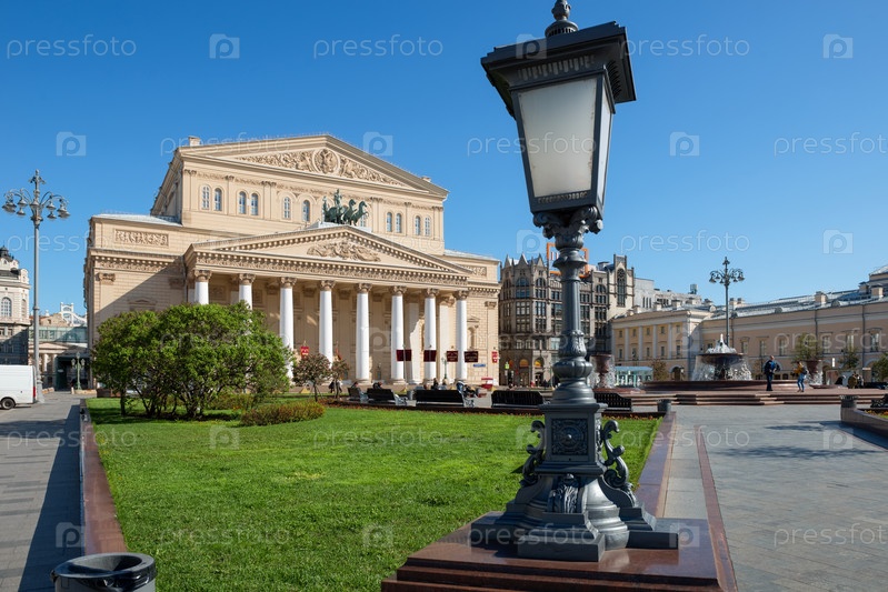 Москва, Россия - 10 мая 2021 года: Вид на Театральную площадь перед Большим театром (Большой театр). Архитектура и достопримечательность Москвы, дневной городской пейзаж Москвы. Большой старый фонтан на Театральной площади в историческом центре Москвы