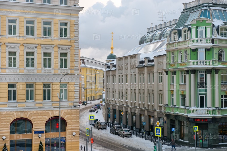 Москва, Россия - 17 января 2021 г.: Вид на Садовническую улицу морозным зимним утром после сильного снегопада