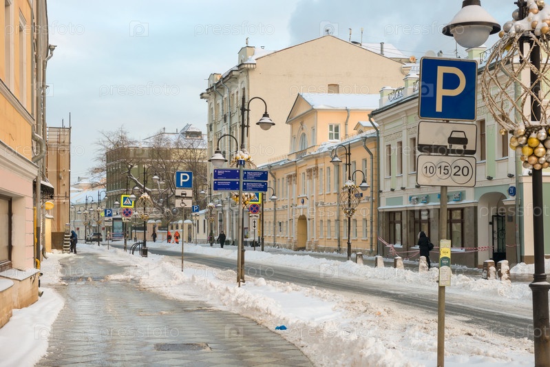 Москва, Россия - 17 января 2021 г.: Вид на Пятницкую улицу морозным зимним утром после сильного снегопада