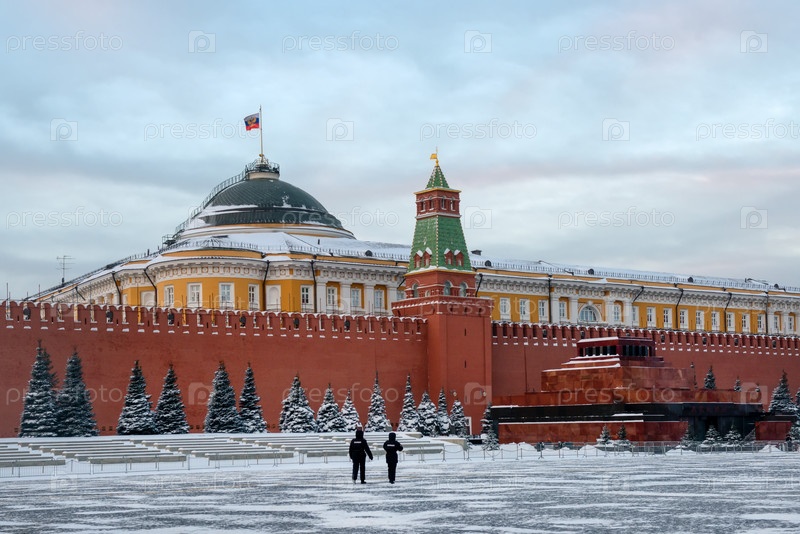 Вид на Красную площадь морозным зимним утром. Здание Мавзолея Ленина (надпись Ленин), Кремлевская башня и башня, здание Сената в Кремле