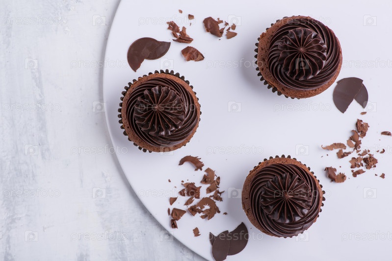 Шоколадный кекс на белой тарелке, вид сверху, крупный план