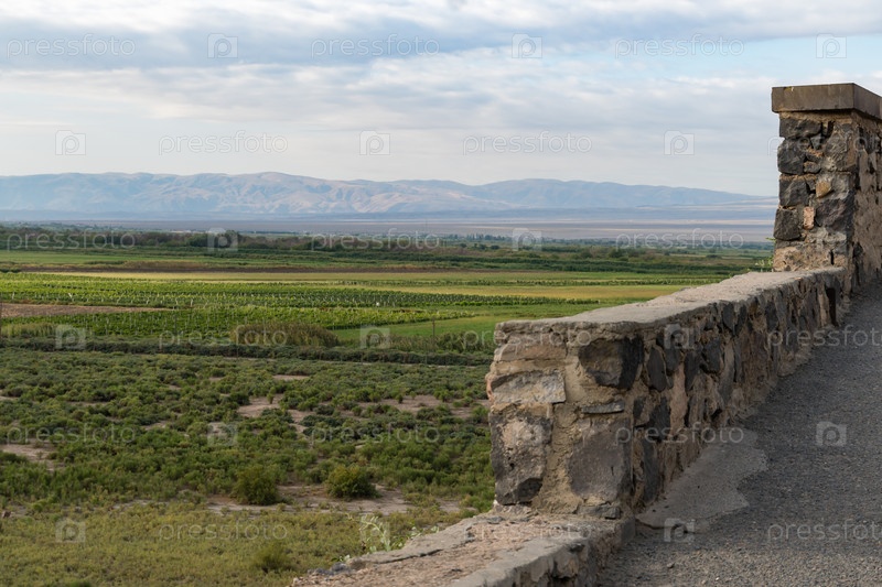 Часть крепостной стены и вид на горы в Армении