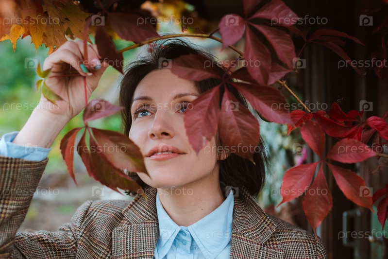 Красивая молодая женщина закрыла лицо желтым осенним листом, улыбаясь на фоне покрасневшей листвы. Осенний модный сезон. Свободное место для текста