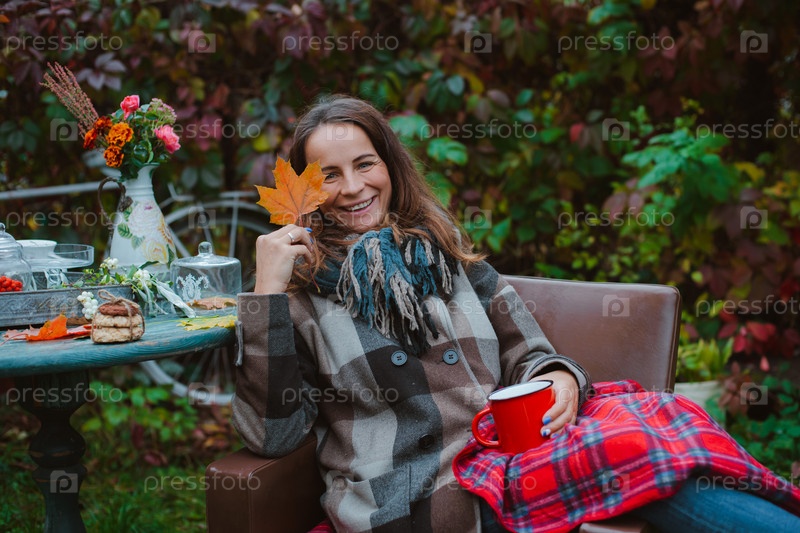 Молодая женщина в коричневом пальто сидит в кресле за столом с красной кружкой, завернутой в плед на открытом воздухе на фоне осенней покрасневшей листвы