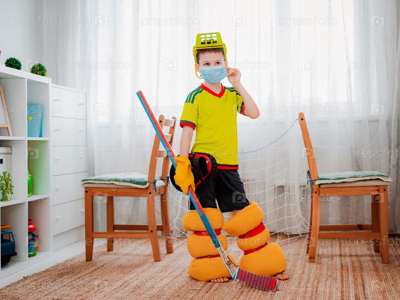 Мальчик играет дома в хоккей, соорудив своими руками форму из подручных средств и ворота из стульев