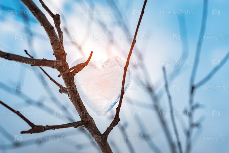 Ледяные ветви сердца на фоне лучей весеннего неба. концепция любви, романтика, 14 февраля, День святого Валентина. зимние каникулы. ледяное сердце. весеннее время