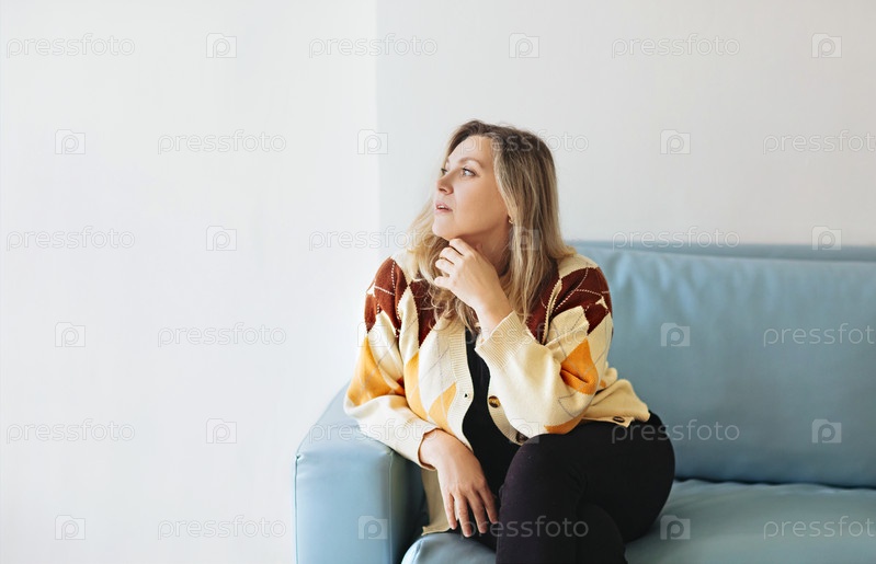 Портрет улыбающейся красивой женщины средних лет со светлыми волосами, сидящей дома на диване и держащей подбородок рукой