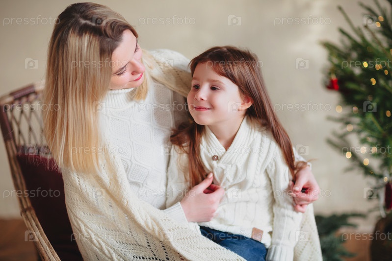 Счастливая игривая маленькая девочка играет с позитивной мамой, прыгает на диване, проводит время вместе во время рождественских каникул дома