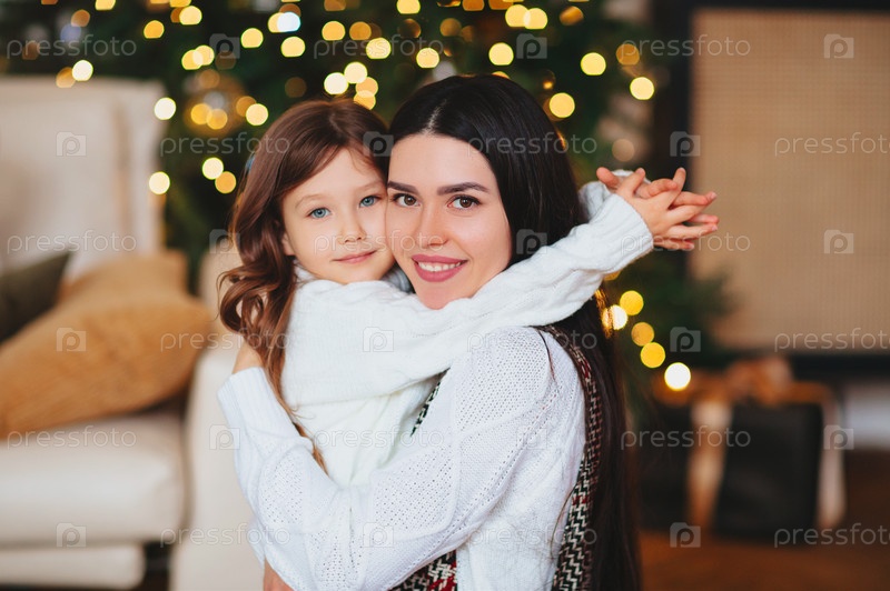 Счастливая игривая маленькая девочка играет с позитивной мамой, прыгает на диване, проводит время вместе во время рождественских каникул дома
