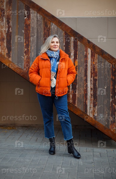 Счастливая позитивная женщина средних лет в оранжевом пуховике улыбается в камеру, позируя на бетонной серой стене