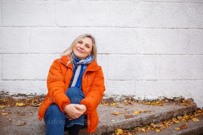Счастливая улыбающаяся женщина средних лет в оранжевом пуховике сидит на бетонной лестнице на открытом воздухе