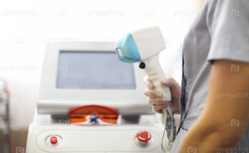 Молодая женщина-косметолог в медицинской форме настраивает машину для фотоомоложения или лазерной эпиляции в ожидании следующего клиента в спа-салоне