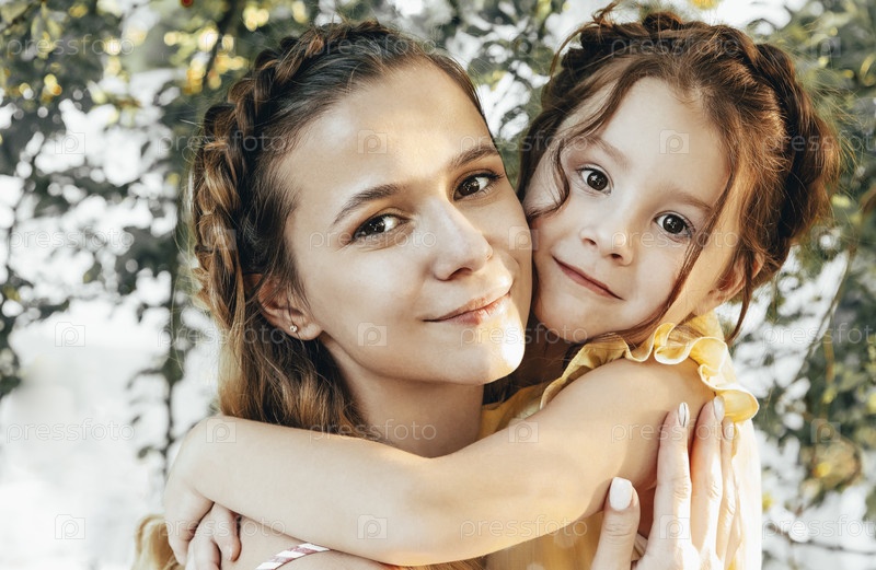 Материнство и любящее материнство. Красивая молодая мама с заплетенными волосами обнимает свою прекрасную маленькую сладкую дочь