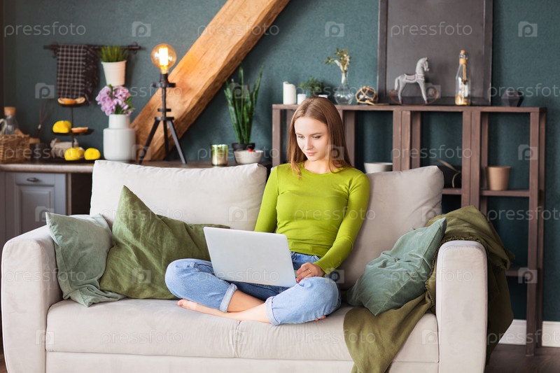 Портрет довольно привлекательной веселой блондинки-фрилансера, работающей удаленно на ноутбуке дома