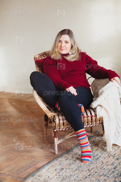 Привлекательная счастливая женщина средних лет сидит и отдыхает на удобном стуле дома