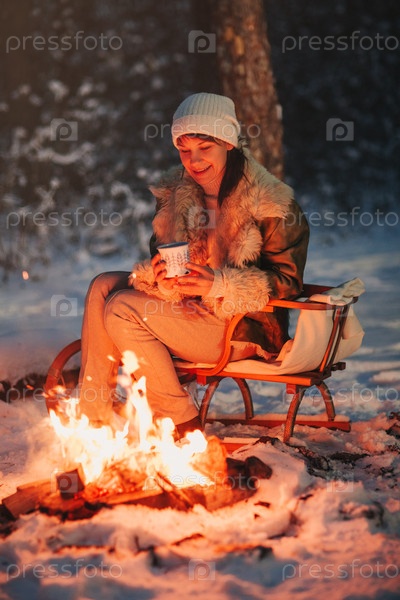 Счастливая молодая женщина в теплой вязаной шапке и куртке сидит на деревянных санях у костра с чашкой горячего чая