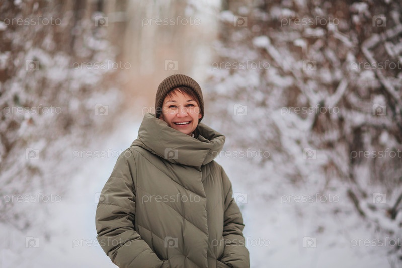 Счастливая улыбающаяся женщина, стоящая на открытом воздухе в снежном зимнем лесном пейзаже позади